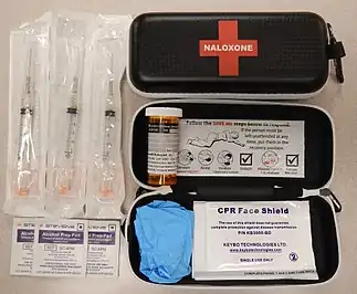 Он входит в состав наборов для неотложной помощи при передозировке, которые в Канаде, США и других странах раздают людям, зависимым от опиоидов, и работникам служб экстренного реагирования (полиции, пожарным, парамедикам)[4].