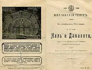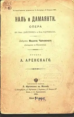 9 января 1904 года в Большом театре состоялась первая постановка оперы «Наль и Дамаянти»[2]. Либретто Модеста Чайковского по мотивам одноимённой повести В. Жуковского. Музыка Антона Аренского[3]. Опера исполнялась 7 раз. 29 декабря 1905 года она была показана в последний раз[4]. 25 января 1908 года опера была поставлена в Мариинском театре в Петербурге[5].