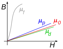 В ферромагнитных материалах нет однозначной связи между и из-за магнитного гистерезиса, эта связь зависит от предыстории намагничивания тела.