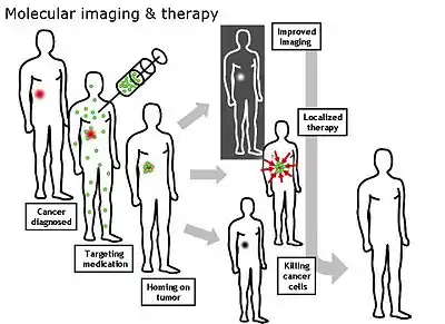 Нанотехнология обеспечила возможность доставки лекарств к определённым клеткам с помощью наночастиц. Общий объём потребления лекарства и побочные эффекты могут быть значительно снижены с помощью размещения активного агента только в больном регионе, и в дозе не большей, чем требуется. Этот выборочный метод может снизить стоимость лечения и страдания людей. В качестве примера можно привести дендримеры и нанопористые материалы. Другой пример — это использование ко-полимеров, которые формируют мицеллы для инкапсуляции лекарств[14]. Они могут хранить маленькие молекулы лекарств и транспортировать их к желаемому месту. Другое видение проблемы базируется на маленьких электромеханических системах; наноэлектромеханические системы исследуются для активного высвобождения лекарств. Потенциально важные применения включают лечение рака с помощью наночастиц железа или золотых капсул. Целенаправленная или персонализированная медицина предназначена для уменьшения потребления лекарств и стоимости лечения, что в результате даёт общественную пользу, снижая затраты на здравоохранение.