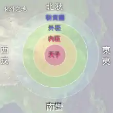 Срединное Государство: Внешний круг чиновников Сына Неба (天子) находятся в контакте с подданными царствами (朝贡国), стоящими на пути аккультурации. Снаружи (化外之地) расположены: Восточные варвары Дун-и (東夷), Западные варвары Си-жун (西戎), Южные варвары Наньмань (南蠻) и Северные варвары Бэй-ди (北狄).