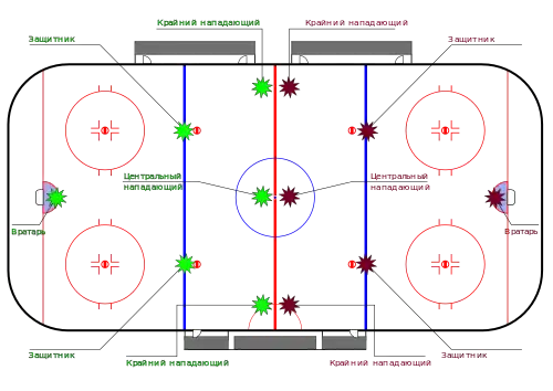 Нападающими являются три игрока из хоккейной пятёрки, центральный нападающий и двое крайних. Центральный является организатором атак, связывая защитников с крайними нападающими, во время обороны активно помогает своим защитникам. Правый и левый крайние нападающие — специалисты по завершению атак, основные действующие лица при игре в зоне соперника, оборонительными обязанностями почти не наделены.