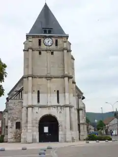Около 9:45 по местному времени двое вооружённых ножами боевиков взяли заложников в церкви в городе Сент-Этьенн-дю-Рувре во время утренней службы. В заложниках оказались пять человек, находившихся в тот момент в церкви, среди которых один священник, две монахини и два прихожанина. Еще одна монахиня успела убежать и предупредить полицию[2]. Нападавшие перерезали горло 85-летнему священнику Жаку Амелю[3], ещё один из заложников тяжело ранен. Нападавшие были застрелены полицией[4].
