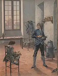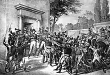 После термидорианского переворота Буонапарте из-за своих связей с младшим Робеспьером был арестован (9 августа[К 6] 1794 года, на две недели)[73]. После освобождения продолжил подготовку к отвоеванию Корсики у Паоли и британцев. 3 (по другим данным 11) марта 1795 года Наполеон в составе экспедиции из 15 кораблей и 16 900 солдат отплыл из Марселя, однако эта флотилия скоро была рассеяна британской эскадрой[74][75].
