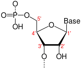 Наименование атомов углерода в нуклеотидах (исходя из нумерации атомов углерода в молекуле сахара пентозы) дает начало двум концам — 5' и 3' (произносятся как пять-штрих и три-штрих, англ. five prime end, three prime end).