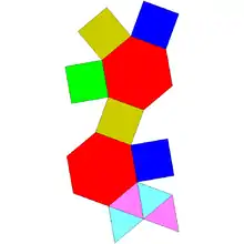 Составлена из 11 граней: 4 правильных треугольников, 5 квадратов и 2 правильных шестиугольников. Каждая шестиугольная грань окружена пятью квадратными и треугольной; среди квадратных граней 3 окружены двумя шестиугольными и двумя квадратными, остальные 2 — двумя шестиугольными, квадратной и треугольной; среди треугольных граней 2 окружены шестиугольной и двумя треугольными, другие 2 — квадратной и двумя треугольными.