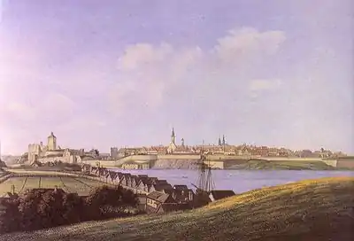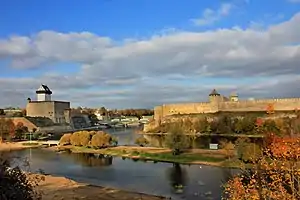 В 1492 году для борьбы с Ливонией великий князь московский Иван III построил напротив Нарвы (Ругодива[14][15][16]) Ивангородскую крепость[17]. Во время Ливонской войны Нарва была взята русскими войсками 11 мая 1558 года. Царь Иван Грозный планировал сделать Нарву крупным торговым и военным портом Руси на Балтийском море. В городе были построены православные храмы, за 23 года русского правления в него переселились немало русских купцов и ремесленников. Нарвская торговля с городами Северной Германии, Дании, Голландии, Франции и Англии стала очень прибыльной и быстро развивалась. Однако для Шведского королевства и Речи Посполитой появление русских в Балтийском море было крайне нежелательным, из-за чего оба государства вступили в войну. В битве под Венденом на ливонском театре военных действий наступил перелом. В августе 1579 года шведы предприняли первую попытку овладеть Нарвой, но отступили, потеряв около 4000 человек. Во время осады 1581 года шведам, однако, удалось овладеть городом, после чего в нём было вырезано около 7000 русских горожан.
