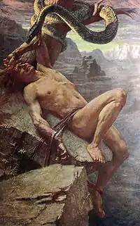 Локи уже нечего было надеяться на пощаду. Асы пришли с ним в одну пещеру, взяли три плоских камня и поставили на ребро, пробив в каждом по отверстию. Потом захватили они сыновей Локи, Вали и Нари, или Нарви. Превратили асы Вали в волка, и он разорвал в клочья Нарви, своего брата. Тогда асы взяли его кишки и привязали Локи к тем трем камням.