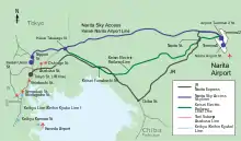Keisei и поезда Shibayama Railway также следуют на станцию Хигаси-Нарита, расположенную между двумя терминалами, однако эта станция полезна только для тех, кто следует в Сибаяма.