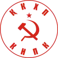 До сентября 2013 года флаг партии представлял собой полотнище красного цвета с соотношением ширины флага к его длине. На верхней части полотнища флага на расстоянии длины флага до древка был изображен барельеф В. И. Ленина. Вдоль верхней части полотнища на казахском и русском языках надпись: «Қазақстан Коммунистік Халық партия» — «ҚКХП», «Коммунистическая Народная партия Казахстана» — «КНПК»[18]. Эмблемой партии являлось изображение серпа и молота, по окружности которого выполнена аббревиатура названия партии на казахском и русском языках («ҚКХП», «КНПК»)[18].