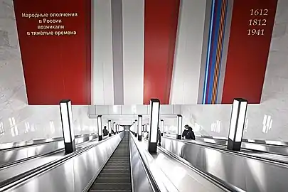 В интерьерах вестибюлей и на путевых стенах платформы станции нанесены рисунки, выполненные УФ-печатью на алюминиевых панелях. Темы рисунков — народные ополчения, организованные для защиты России от иностранных войск в 1612, 1812 и 1941 годах.