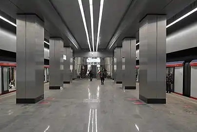 Колонная трёхпролётная станция мелкого заложения с одной островной платформой. Глубина заложения — 28 метров[17].