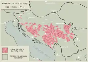 Начало вооружённой борьбы в Сербии связывают с боевой акцией Раджевской партизанской роты под командованием Жикицы Йовановича (Испанца) из Валевского партизанского отряда 7 июля 1941 года у деревни Бела-Црква (на территории Западной Сербии), когда был убит патруль жандармов, пытавшийся разогнать народное собрание[40][41]. Нападениям партизанских боевых групп и отрядов подвергались сербские полицейские участки и муниципалитеты, чиновники-коллаборационисты, актив русской белогвардейской эмиграции, члены их семей[41][42]. Совершались диверсии и акции саботажа. В сентябре 1941 года стали образовываться районы, относительно свободные от оккупационной и коллаборационистской власти. В них под контролем КПЮ началось формирование местных органов, по утверждению коммунистов, новой «народной власти», названных народно-освободительными комитетами. Новая повстанческая власть под руководством КПЮ не только противостояла оккупантам и их пособникам, но и открыто противопоставляла себя прежним югославским органам власти. К концу сентября восстание в Сербии достигло своего пика. Оно охватило территорию от Ниша до Белграда и Баната. Эпицентр движения Сопротивления находился в Западной Сербии и Шумадии. Здесь, в промышленных районах Ужице, Валева, Чачака и Крупани, собрались многие неимущие сербские беженцы из Хорватии. В рабочей среде этих городов коммунисты пользовались значительной поддержкой. Оба этих фактора способствовали притоку добровольцев в ряды партизанских отрядов. Контролируемая повстанцами территория, известная как Ужицкая республика, включала города Ужице, Чачак, Пожегу, Горни-Милановац и другие населённые пункты. 16 сентября Тито покинул Белград и 18 сентября прибыл в село Робае около города Валево на освобождённой территории. К этому времени в Сербии было сформировано 28, а после проведённой реорганизации 24 партизанских отряда общей численностью около 14 тысяч бойцов[43][44][37][45][46]. На всей территории Югославии ко времени совещания в Столице (26—27 сентября) было сформировано 232 партизанских отряда (расформирован 31 отряд) и 71 отдельный батальон (из них 44 были переформированы или вошли в состав партизанских отрядов, 27 батальонов продолжали действовать)[К 4]. В Словении было создано 20 партизанских рот, имевших характеристики партизанских отрядов. Имевшиеся в наличии вооружённые силы вселяли уверенность в успешном продолжении народно-освободительной борьбы. Вооружённое сопротивление развивалось почти на всей территории Югославии, а в Сербии, Черногории, Боснии и Герцеговине, а также части Хорватии, оно приняло характер массового народного движения. Используя политические ошибки и преступления оккупационных и коллаборационистских властей, а также военные слабости оккупационного режима (неподготовленность регулярных частей к асимметричному конфликту, неготовность коллаборационистских формирований), партизаны создали к октябрю освобождённые территории во всех частях страны[48][46].