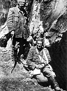 ![]() Сверху по часовой стрелке: встреча Адольфа Гитлера и Анте Павелича в Бергхофе; Степан Филипович выкрикивает перед своей казнью «Смерть фашизму, свобода народу!»; генерал Дража Михайлович и его четники; усташи; Иосип Броз Тито (первый справа) и его соратники в Дрваре, 14 мая 1944 года. | |||