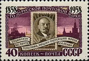 | Марка СССР (1958) с цитатой Ленина из выступления от 29 апреля 1918 года (ЦФА [АО «Марка»] № 2209) |