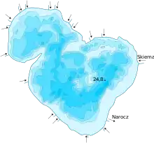Нарочь — самое большое озеро в Белоруссии[9]. Площадь его зеркала — 79,6 км². Наибольшая глубина — 24,8 м. Длина наибольшего поперечника — 12,8 км. Длина береговой линии — 40 км (четвёртое место среди озёр Белоруссии[9]). Объём воды — 710 млн м³ (первое место среди озёр Белоруссии[9]). Площадь водосбора — 199 км². Площадь поверхности — 79,62 км². Высота над уровнем моря — 165 м. Всего в озеро впадает шестнадцать ручьёв, помимо них с восточной стороны в Нарочь впадает протока Скема из озера Мястро, а с юго-восточной — вытекает река Нарочь[2][1]. Размах колебаний уровня около 2 м. Замерзает в середине декабря, вскрывается в марте—апреле[10].
