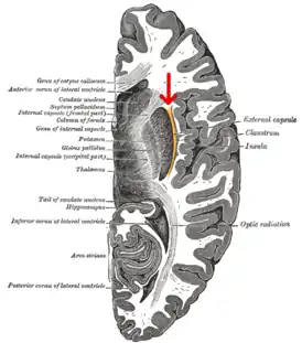 ![]() Горизонтальный разрез правого полушария мозга. Наружная капсула выделена оранжевым цветом и показана красной стрелкой. | |