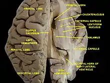 ![]() Глубокий разрез коры больших полушарий, базальных ядер и ствола мозга. Наружная капсула видна в центре. | |