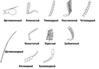 Усики сидят по бокам лба, между глазами или впереди них, нередко в хорошо обособленной усиковой впадине. Они очень разнообразны, характерны для разных групп насекомых. В своей основе усики состоят из утолщённого основного членика, называемого рукояткой (scapus), за которым следует ножка (pedicellus), и, начиная с третьего членика, располагается основная часть — жгутик (flagellum). Различают несколько типов усиков (см. рис.).