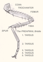 Ноги (pedes) причленены к груди снизу, обычно сидят в тазиковых впадинах и состоят из тазика (coxa), вертлуга (trochanter), бедра (femora), голени (tibia) и лапки (tarsus). Тазик и вертлуг обеспечивают необходимую подвижность ноге. В некоторых случаях вертлуг состоит из двух члеников. Бедро является самой крупной и сильной частью ноги, так как имеет мощную мускулатуру. Его сочленение с голенью называют коленным, а прилегающую к нему часть — коленом (geniculus). Голень по длине примерно равна бедру, но тоньше его, снабжена шипами (spinae), а на вершине — шпорами (calcariae). Лапка обычно расчленена, состоит из 2—5 члеников, на вершине несёт пару коготков (unguiculi), между которыми располагается широкая присоска — аролий (arolium) или узкий эмподий (empodium). Соответственно образу жизни ноги подверглись разнообразной специализации, поэтому различают несколько их типов.