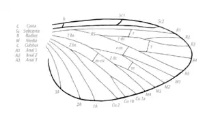 Крылья насекомых (alae) представляют собой пластинчатые выросты покровов, связанные с комплексом обслуживающих их мышц и преобразованных склеритов груди. В типичном случае их две пары: передняя, прикреплённая к среднегруди, и задняя — на заднегруди. Крылья состоят из тонкой крыловой пластинки (membrana), укреплённой на твёрдых жилках (venae), играющих роль прочной основы крыла. Жилки делятся на продольные и поперечные, образующие у более низкоорганизованных групп густую сеть и многочисленные ячейки (cellulae). Поперечные жилки у высших форм сокращаются в числе и иногда исчезают совсем, так как главную поддерживающую роль несут продольные, попеременно выпуклые и вогнутые жилки. Поэтому продольные жилки, хотя и претерпели у высших групп значительную эволюцию, всё же сохранили свою основу.