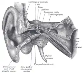 ![]() Наружное и среднее ухо человека (фронтальный разрез, правая сторона) | |