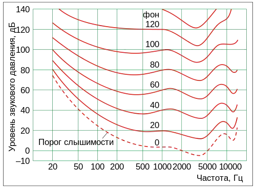 Вследствие этого человеческое ухо наиболее чувствительно к акустическим колебаниям частотой около 3 кГц (сюда относится большая часть звуков речи) — они лучше воспринимаются (см. рисунок), но при чрезмерной интенсивности нередко приводят к акустическим травмам, поэтому весьма типична потеря слуховой чувствительности именно в таком частотном диапазоне[35].