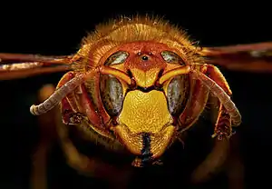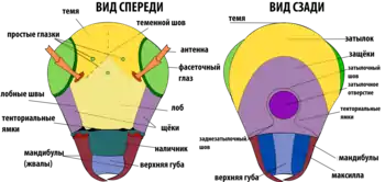 Основой головы является черепная коробка (epicranium). Внутри неё есть особая скелетная структура — тенториум. На голове различают переднюю поверхность — лоб (frons), который сверху переходит в темя (vertex) и далее назад — в затылок (occiput). Спереди ото лба лежит хорошо обособленная пластинка — наличник (clypeus), далее вперёд (вниз) — верхняя губа (labrum), подвижный пластинчатый кожный выступ, прикрывающий сверху ротовые органы. На боках головы, под глазами, различают щёки (genae), сзади переходящие в виски (tempora), а снизу лежит горло (gula). С боков головы расположены фасеточные глаза (oculi), состоящие из множества зрительных единиц — омматидиев — и являющиеся основными органами зрения. Они характерны почти для всех взрослых насекомых и личинок насекомых с неполным превращением. Вторичное их исчезновение отмечается у блох и веерокрылых. Кроме этого, между сложными глазами обычно расположено от одного до трёх простых глаз, или глазков (ocelli). В зависимости от биологии положение головы неодинаково. Различают гипогнатическую голову (caput hypognathum) — с ротовыми органами, обращёнными вниз, подобно ногам, — и прогнатическую голову (caput prognathum) — с ротовыми органами, обращёнными вперёд. Первый тип обычно характерен для растительноядных, а второй — для хищных насекомых. Усики находятся по бокам лба, между глазами или впереди них, нередко в обособленной усиковой впадине. Они очень разнообразны, характерны для разных групп насекомых. В своей основе усики состоят из утолщённого основного членика, называемого рукояткой (scapus), за которым следует ножка (pedicellus) и, начиная с третьего членика, располагается основная часть — жгутик (flagellum). Различают несколько типов усиков[33].