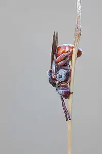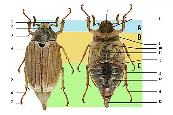 Тело насекомых подразделяется на три сегментированных отдела: голова, грудь и брюшко[33][34]. Каждый сегмент подразделяется на четыре части — верхнее полукольцо называется тергит, нижнее полукольцо называется стернит, боковые стенки — плейриты. При обозначении взаимного расположения частей тела и органов термином «дорсальный» (dorsalis) обозначают верхнюю сторону тела, а «вентральный» (ventralis) — нижнюю сторону. Выделяют также мезосому (у муравьёв из трёх грудных сегментов и первого абдоминального сегмента проподеума) и метасому (стебелёк и брюшко).