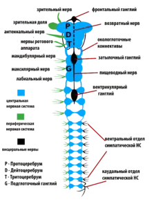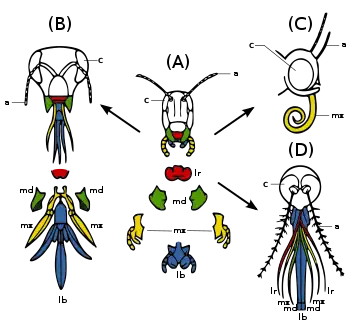Голова (caput) внешне нечлениста, но эволюционно произошла путём слияния пяти сегментов тела и акрона в процессе олигомеризации тела. Сохранившимися конечностями этих сегментов являются усики, или антенны первые (antennae), и 3 пары ротовых конечностей — нечленистые верхние челюсти, или мандибулы (mandibulae), членистые нижние челюсти, или максиллы (maxillae), и членистая, внешне непарная нижняя губа (labium), являющаяся второй парой нижних челюстей, слившихся между собой. Различают несколько типов ротовых органов, из которых первичным является грызущий, предназначенный для разрывания и поглощения относительно твёрдой пищи. В процессе эволюции возникло несколько модификаций данного исходного типа, которые у разных групп насекомых устроены по-разному. В одних случаях питание связано с проколом пищевого субстрата — колюще-сосущий ротовой аппарат (клопы, тли, цикады, комары и др.), в других приём пищи не сопровождается проколом — трубчато-сосущий тип — у большинства бабочек[33]. Грызуще-лижущий тип приспособлен к питанию жидкой пищей и характерен для ос и пчёл. Особую модификацию представляет мускоидный тип ротового аппарата, возникший у мух и приспособленный к потреблению как жидкой, так и твёрдой пищи. Другой путь развития исходного ротового аппарата наблюдается у скрыточелюстных, нижняя губа которых слилась с т. н. оральными складками, образовав парные челюстные карманы, в которые погружены мандибулы и максиллы. Существует также множество других типов, которые нередко представляют собой переходные формы между вышеописанными типами[33].
