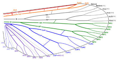 В исходном состоянии различают следующие продольные жилки: костальную (costa, или C); субкостальную (subcosta, Sc); радиальную (radius, R), снабжённую сзади ветвью — радиальным сектором (radii sector, RS); срединную (media, M), иногда делится на переднюю (MA) и заднюю (MP) ветви; кубитальную (cubitus, Cu), в числе двух, нередко сближенных жилок — передней (CuA) и задней (CuP); анальные (analis, A).
