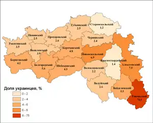 В 2002 г. украинцами себя назвали 57,8 тыс. жителей региона, а в 2010 г. — 41,9 тыс. Как показала последняя перепись населения 2010 г. из 41,9 тыс. этнических украинцев, живущих в регионе, 3,6 тыс. (9 %) были уроженцами Белгородской области[79]. Таким образом, автохтонное украинское население, составлявшее ещё 90 лет назад 683 тыс., сократилось ныне до 3,6 тыс. человек.