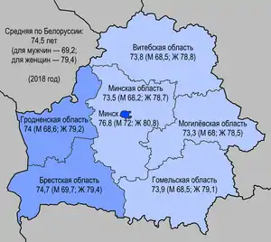 В 2012 году ожидаемая продолжительность жизни в Белоруссии составила 72,2 года, в 2018 году — 74,5 лет. В 2012 году этот показатель составил у мужчин 66,6 лет, у женщин — 77,6 лет; в 2018 году — 69,2 и 79,4 лет соответственно[16][17]. По сравнению с Россией и Украиной это несколько выше, по сравнению с другими европейскими странами — значительно ниже. Проблемой остаётся значительная разница в продолжительности жизни мужчин и женщин. В 2008 году она составляла 12 лет, тогда как по оценке Программы развития ООН естественной разницей считается 5 лет. В городской местности разница в продолжительности жизни мужчин и женщин составляет 11 лет, в сельской — 14 лет[18]. К 2018 году разница в продолжительности жизни между мужчинами и женщинами составила 10,2 года, в том числе 9,7 лет в городах и посёлках и 11,4 лет — в сельской местности[17]. Из-за этого дисбаланса мужчины, вышедшие на пенсию на общих основаниях, получают пенсионные выплаты 7,8 лет, женщины — 22,7 года (2019 год)[19]. Средняя продолжительность жизни в городах и посёлках по состоянию на 2018 год — 75,6 лет (70,4 у мужчин и 80,1 у женщин), в сельской местности — 71 год (65,8 у мужчин и 77,2 у женщин)[17].