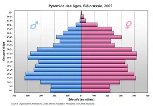 В Белоруссии людей старше 60 лет на 1 января 2013 года было 19,64 % от численности населения республики[20] (по классификации ООН страна считается старой, если таких людей — 14 %)[21]. В последние годы в стране увеличивается доля детей от 0 до 14 в общей численности населения — 15,43 % на 1 января 2013 года (14,74 % по переписи 2009 года)[20].