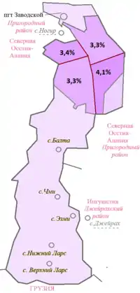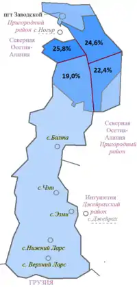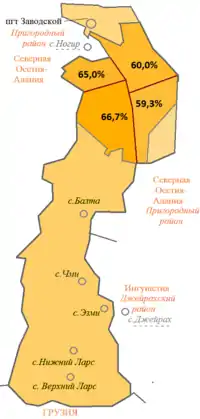 | осетины | 2 916 чел. (6,67 %) | 10 799 чел. (14,35 %) | 22 746 чел. (17,40 %) | 37 731 чел. (22,95 %) | 78 115 чел. (33,07 %) | 110 250 чел. (39,53 %) | 138 769 чел. (46,23 %) | 187 810 чел. (59,51 %) |