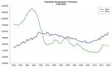 Население Федеративной Республики Германия 83 166 711 чел. (2020). Германия — самая населенная страна в Евросоюзе и третья по населению в Европе, после России и Турции. 9 мая 2011 года, впервые со времени объединения Германии, была проведена всеобщая перепись населения. Германия является второй в мире страной по популярности иммиграции после США[1]. По данным 2013 года, из 8,1 миллионов семей с несовершеннолетними детьми около 2,5 миллионов семей (31 %) имели мигрантские корни, то есть хотя бы один из родителей был либо иностранцем, либо принявшим немецкое гражданство мигрантом, либо является немецким переселенцем из стран СССР или восточной Европы. При этом общее число семей с несовершеннолетними детьми уменьшилось в сравнении с 2005 годом, тогда их насчитывалось 8,9 миллионов.[2] По официальным данным, в 2013 году в Германии проживало 29,6 миллионов мигрантов и их потомков (в том числе 12,1 миллионов мигрантов, обладающих немецким гражданством), что составляет 25,6 % населения ФРГ. Из них около 7,2 миллионов человек являются потомками мигрантов и были рождены уже в Германии.[3] В 2015 году доля населения с миграционными корнями составила 21 % (в том числе в группе «дети до 5 лет» — 36 %).[4] По состоянию на 2016 год в общей сложности иммигранты и их прямые потомки (включая этнических немцев-репатриантов) составляли 18,6 миллиона человек, или 22,5 % населения Германии[5]. По состоянию на 2019 год, по оценкам ООН, в Германии проживало 13,1 миллиона иммигрантов и их потомков, или 15,7 % населения страны[6].
