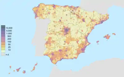 Согласно данным института INE, на 1 января 2005 года в стране проживало 3,5 миллиона иммигрантов (8 % населения); на 2006 год 9,27 % населения Испании по национальности были иностранцами; на 2020 год проживало 7,2 миллиона иммигрантов (15,22 % населения страны). Испания является 9-й страной ЕС по показателям внутриевропейских иммигрантов. Иммиграция дает 100 % прироста населения Испании: [2]