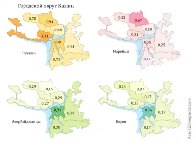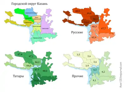 Казань является одной из самых многонациональных территорий России: представители свыше 115 национальностей проживают на территории города. Двумя крупнейшими национальностями в Казани являются русские (48,6 % или 554,5 тыс. чел. по переписи населения 2010 года) и татары (47,6 % или 542,2 тыс. чел.). Также в городе представлены чуваши (0,8 % или 9,0 тыс. чел.), украинцы (0,4 % или 4,8 тыс. чел.), марийцы (0,3 % или 3,7 тыс. чел.), башкиры (0,2 % или 1,8 тыс. чел.), удмурты (0,1 % или 1,4 тыс. чел.) и др.[51]