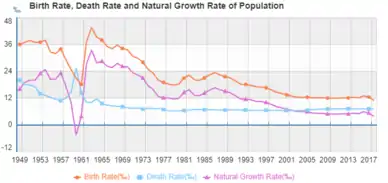 Усугубляющим фактором демографического кризиса в Китае, является то, что в Китае, как и практически во всех странах Восточной Азии (кроме Монголии), один из самых низких уровней суммарного коэффициента рождаемости в мире (наряду со странами Европы). По состоянию на 2020 год в Китае СКР составлял - 1,3 ребёнка на одну женщину (2020).[1][2][3][4] Для примера в Республике Корее в 2020 году была зафиксирована самая низкая рождаемость в мире - СКР составил 0,84[6] Население стран Восточной Азии (кроме Монголии) находясь в общемировом процессе старения населения Земли (кроме Африки южнее Сахары) и вызванного им уже в ряде стран, как развитых так и развивающихся, демографического кризиса, наряду с население Европы и рядом стран Юго-Восточной Азии (таких как Сингапур и Таиланд), имеет самый высокий средний возраст населения и подвержено наиболее быстрому старению населения на планете Земля. Но, в отличие от стран Европы, страны Восточной Азии имеют зачастую более строгую иммиграционную политику, что не позволяет им притормаживать, как в странах Европы, процессы естественного старения населения, и как следствие всё более растущей смертности и естественной убыли населения, а также роста среднего возраста населения.[7][8][9][10][11][12][13] Население Китая характеризуется высоким средним возрастом, что является следствием политики «одна семья — один ребёнок». Темп прироста населения Китая составляет всего 0,49 %, занимая 151-е место в мире (на 2011 г.).[14].
