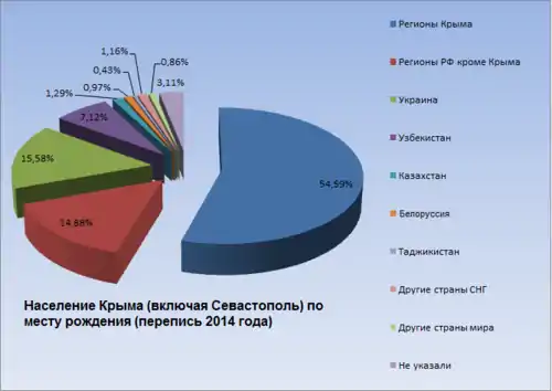 По данным переписи населения 2001 года, 49,1 % жителей республики были крымчанами по месту рождения (993 656 человек из 2 024 056 постоянных жителей АР Крым); 18,8 % были уроженцами регионов Российской Федерации (379 993 человек); 16,1 % были выходцами из других регионов Украины (325 424 человека, в том числе 29 594 человек из Херсонской, 23 610 человек из Винницкой, 23 132 человек из Донецкой, 21 701 человек из Хмельницкой, 21 506 человек из Сумской, 19 781 человек из Житомирской областей). Помимо этого, 8,1 % родились в Узбекистане (164 707 человек, в их числе в своём большинстве те из крымских татар, кто родился в Узбекистане в период пребывания в высылке); 1,4 % — в Казахстане (27 413 человек); 1,3 % — в Белоруссии (26 817 человек), 1,9 % — в других республиках бывшего СССР (кроме стран Прибалтики; 39 364 человека), а 2,8 % не указали место рождения (56 741 человек)[93]. По данным украинской стороны, «более 50 % жителей Крыма никогда не выезжали на территорию материковой Украины»[94].