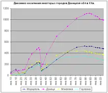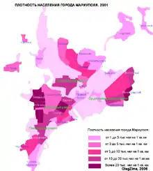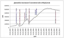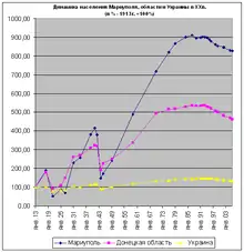 | 1926 | 40,825 | 63,346[8] | Результаты Всесоюзной переписи 17 декабря 1926[9]. Согласно Малая Советская Энциклопедия, 1-е изд. (1930), т.4., стр. 878., по данным переписи в г. Мариуполе - 41 341 чел., Мариуполь-Порт - 7 705 чел., 14 864 чел. - в Заводском райгорсовете (посёлок Завода им. Ильича, пос. Гуглино, пос. Броневой, станция Сартана), 26 605 чел. - в других населённых пунктах Новосёлковского района округа (п. Новосёловка, Аджахи, Успеновка и др.) |