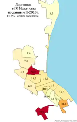 ![]() Даргинцы в городском округе Махачкала в %, перепись 2010 г. |
