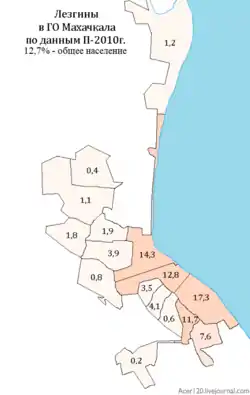![]() Лезгины в городском округе Махачкала в %, перепись 2010 г. |