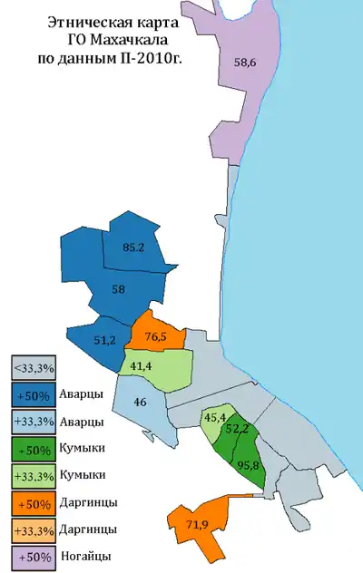 Согласно данным переписи населения 2010 года, в г. Махачкале преобладающим большинством являются аварцы — 26,70 %, затем кумыки — 19,16 %, третьими следуют даргинцы — 15,30 %, четвёртыми лезгины — 12,71 %, пятыми лакцы — 12,35 %