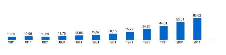По состоянию на 2011 год население Раджастхана составляло 68,62 млн человек (в 2001 году — 56,5 млн, в 1991 году — 44 млн, в 1981 году — 34,26 млн, в 1971 году — 25,76 млн, в 1961 году — 20,15 млн, в 1951 году — 15,97 млн). Плотность населения (в 2011 году — 201 человек на 1 кв. км, в 1901 году — 30 человек на 1 кв. км) сильно разнится: в пустынных, горных и лесистых областях она значительно ниже, чем в издревле земледельческих (например, согласно переписи 1971 года в Аджмере плотность равнялась 421 человек на 1 кв. км, а в Пали — 78 человек, а согласно переписи 2011 года самым плотнонаселённым округом штата был Джайпур — 598 человек на 1 кв. км, а самым редконаселённым — Джайсалмер — 17 человек на 1 кв. км). По состоянию на 2011 год наиболее населёнными округами Раджастхана были Джайпур (6,66 млн), Джодхпур (3,68 млн), Алвар (3,67 млн), Нагаур (3,3 млн) и Удайпур (3,06 млн), а крупнейшими городами штата — Джайпур (2,32 млн человек), Джодхпур (846,4 тыс. человек), Кота (695,9 тыс. человек), Биканер (529 тыс. человек), Аджмер (485,2 тыс. человек) и Удайпур (389,3 тыс. человек). Деревни западной зоны по своим размерам больше деревень восточной зоны, которые расположены более густо (в конце 80-х годов XX века среднее население западной деревни было 650 человек, восточной — 607 человек, горной деревни — 415 человек). В 2001 году уровень грамотности составлял 60,4 % (в том числе у мужчин — 75,7 %, у женщин — 43,9 %), тогда как десятилетием ранее — 38,5 % (в том числе у мужчин — почти 55 %, у женщин — 20,4 %). Наиболее грамотным был округ Кота (73,5 %), наименее грамотным — Бансвара (44,6 %). Согласно переписи 2011 года уровень грамотности составлял 67 % (в том числе у мужчин — 80,5 %, у женщин — 52,7 %). Из-за сохранения в сельской местности института ранних браков и ранней вовлечённости детей в хозяйственную деятельность посещаемость школ в целом невелика. Самая высокая рождаемость и самая низкая смертность наблюдаются в западной зоне Раджастхана (особенно в её северных областях), тогда как низкая рождаемость и высокая смертность характерны для горных областей на юге и юго-востоке штата, где значительную часть населения составляют «зарегистрированные племена» (потомки автохтонных народов)[18][19][20][21][22].