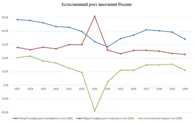 С 1927 года население России в млн. человек, естественный прирост на 1000 человек, миграционный прирост (на 1000 человек) и суммарный коэффициент рождаемости (2,1 уровень воспроизводства населения).