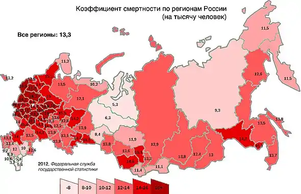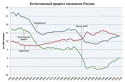 По оценке Росстата, численность постоянного населения России на 1 августа 2021 года составила 145,8 млн человек, сократившись с начала года на 351,5 тыс. человек.[16][17][18] По данным Росстата естественная убыль населения (разница между рождаемостью и смертностью) в России за 9 месяцев 2021 года достигла 675,4 тыс. человек — на 71,6 % больше, чем за тот же период 2020 года (минус 346,9 тыс. человек). В правительстве рассчитывали, что за весь 2021 год естественная убыль составит 522 тыс., по данным сентябрьской версии единого плана по достижению национальных целей развития.[19]