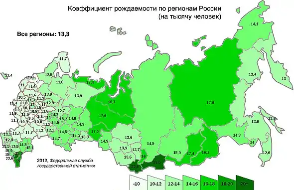 Суммарный коэффициент рождаемости в 2020 году колебался от 2,97 в республике Тыва до 1,06 в Ленинградской области. По состоянию на 2020 год рождаемость выше уровня воспроизводства населения (2,1 рождений на женщину) была только в четырёх субъектах Российской Федерации: Республика Тыва (2,97 рождений на женщину), Чеченская Республика (2,57 рождений на женщину), Ненецкий автономный округ (2,26 рождений на женщину) и Республика Алтай (2,09 рождений на женщину)[25].