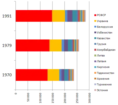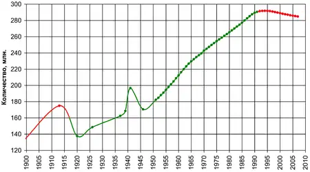 | 1992 (постсоветское пространство) | ↘291 810 000[20] | -2 198 571 |
