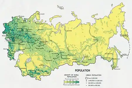 Послевоенный голод 1946—47 года усугубил и без того тяжелые демографические последствия войны за счёт высокой детской смертности[40] и привёл к смерти около 1 миллиона человек[9]. Согласно переписи населения 1926 года в РСФСР проживало 100,9 млн человек (или 92,7 млн человек с учётом переданных позже территорий). На отметку в 100 млн человек республика смогла вернутся лишь в 1949 году[41]. По оценке А. Вишневского, без избыточных потерь первой половины ХХ века население на территории современной России должно было на 76 млн выше фактической уже в 1954 году. Кроме того, кризис смертности в конце 60-х годов обусловил новые демографические потери в 14,2 млн человек. Если бы России удалось избежать демографических катастроф ХХ века, то, при прочих равных условиях, её население могло быть почти на 126,0 млн человек больше, чем оно было в 1990 году[9].